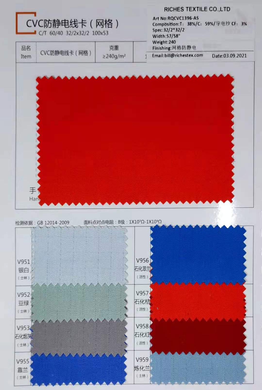 CVC防静电纱卡面料(网格)38%T*59%C*3%导电纱 240克面料