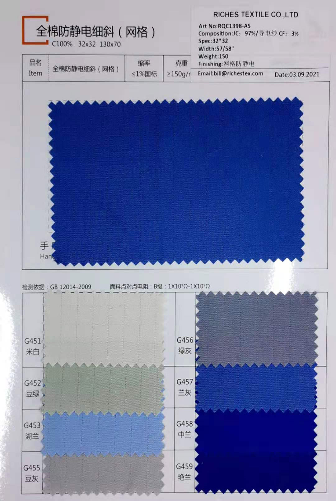 全棉防静电细斜面料(网格)97%C*3%导电纱 150克面料